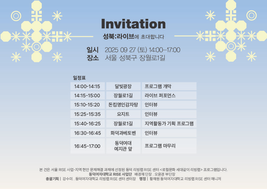 성북:라이브는 누구나 무료로 참여하고 관람할 수 있으며, 행사의 자세한 일정은 포스터와 우리 학교 RISE 사업단 홈페이지 (https://rise.dongduk.ac.kr)를 통해 확인할 수 있다.