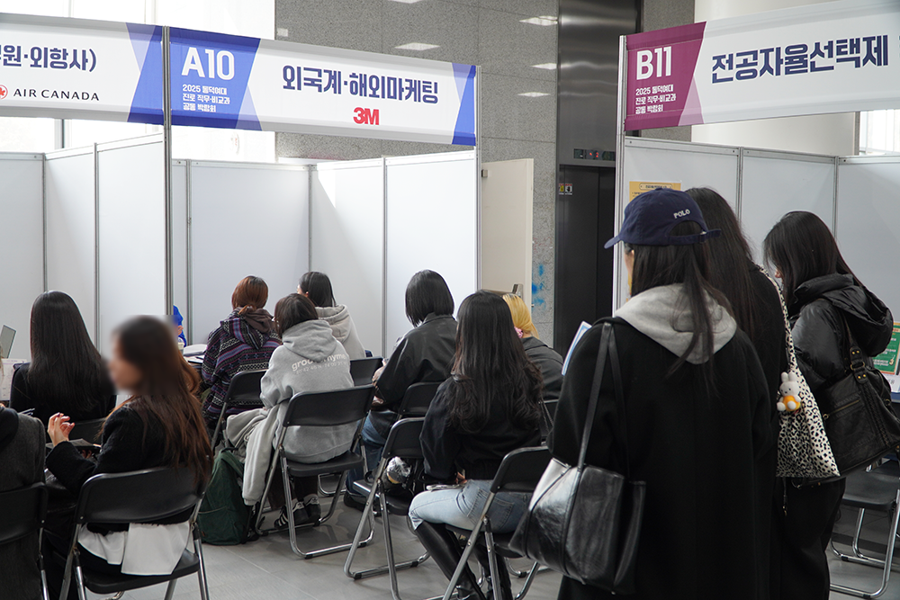특히 기업체 인사·직무 담당자들로부터 직접 상담을 받을 수 있는 진로직무 박람회엔 학생들의 발길이 끊이지 않았다. △공기업 △엔터테인먼트 △방송·미디어 △외국계 △금융 △광고·홍보 △헬스케어 △화장품·뷰티 △항공 △디자인 △SW개발·AI 등 폭넓은 분야의 기업부스가 마련된 결과다. 관심분야에 따라 여러 부스에서 상담을 받는 학생도 상당수였다.