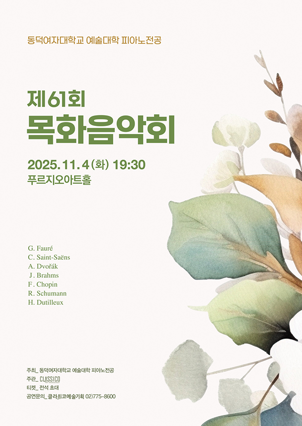 우리 대학 피아노전공이 지난 11월 4일 푸르지오아트홀에서 ‘제61회 목화음악회’를 성공적으로 개최했다.
