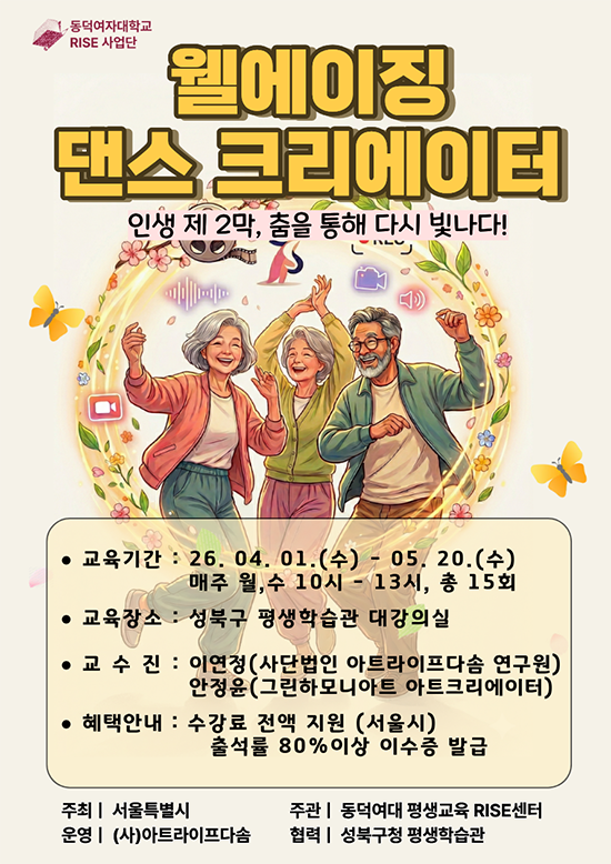 - [동덕뉴스]평생교육 RISE센터, 중장년층 위한 ‘웰에이징 댄스 크리에이터’ 무료 강좌 신설