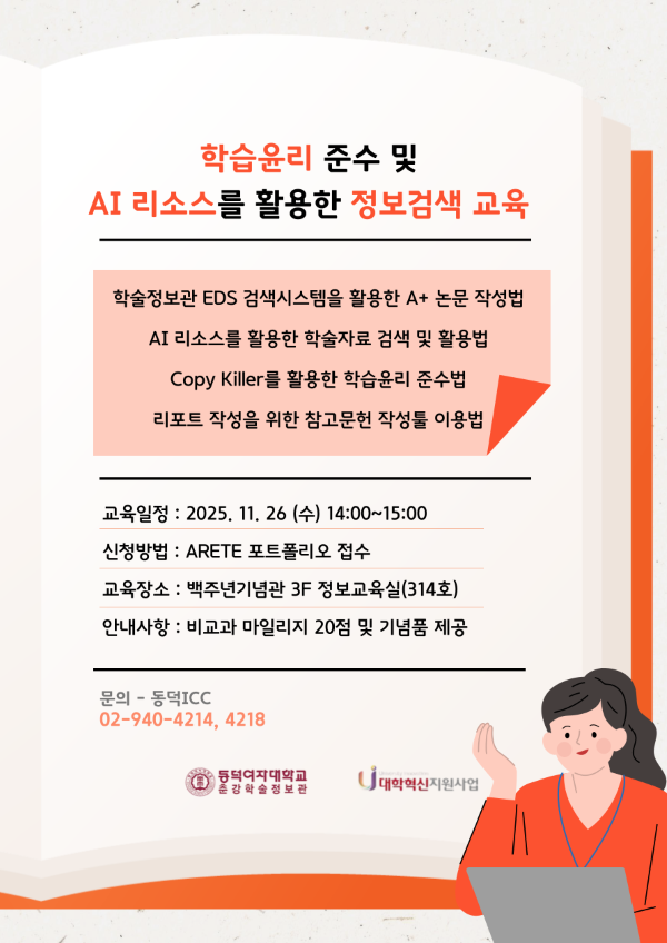 - [춘강학술정보관]학습윤리준수 및 AI리소스를 활용한 정보검색교육(11.26.수)
