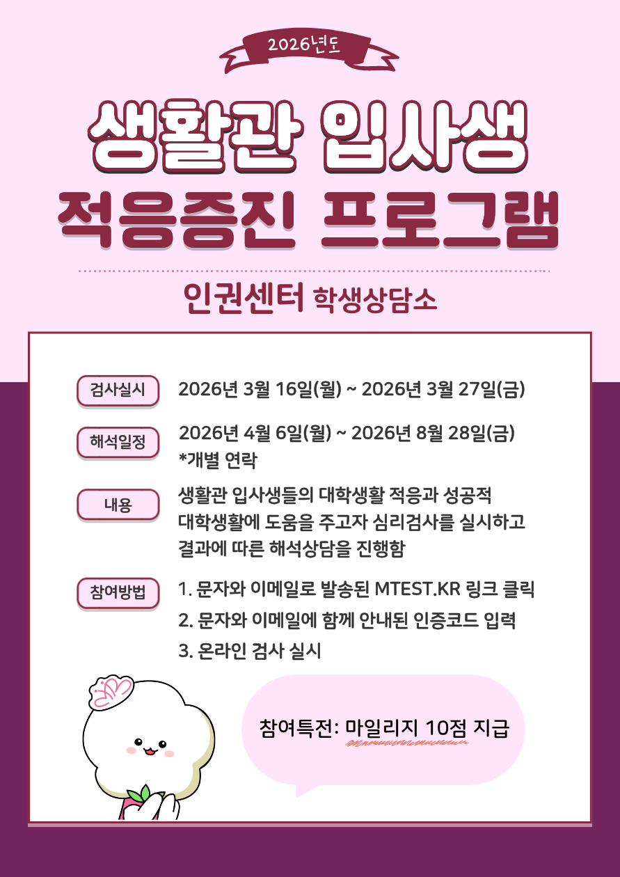 - [기타][인권센터 학생상담소] 생활관 적응증진 프로그램 안내 (입사생 필수참여)