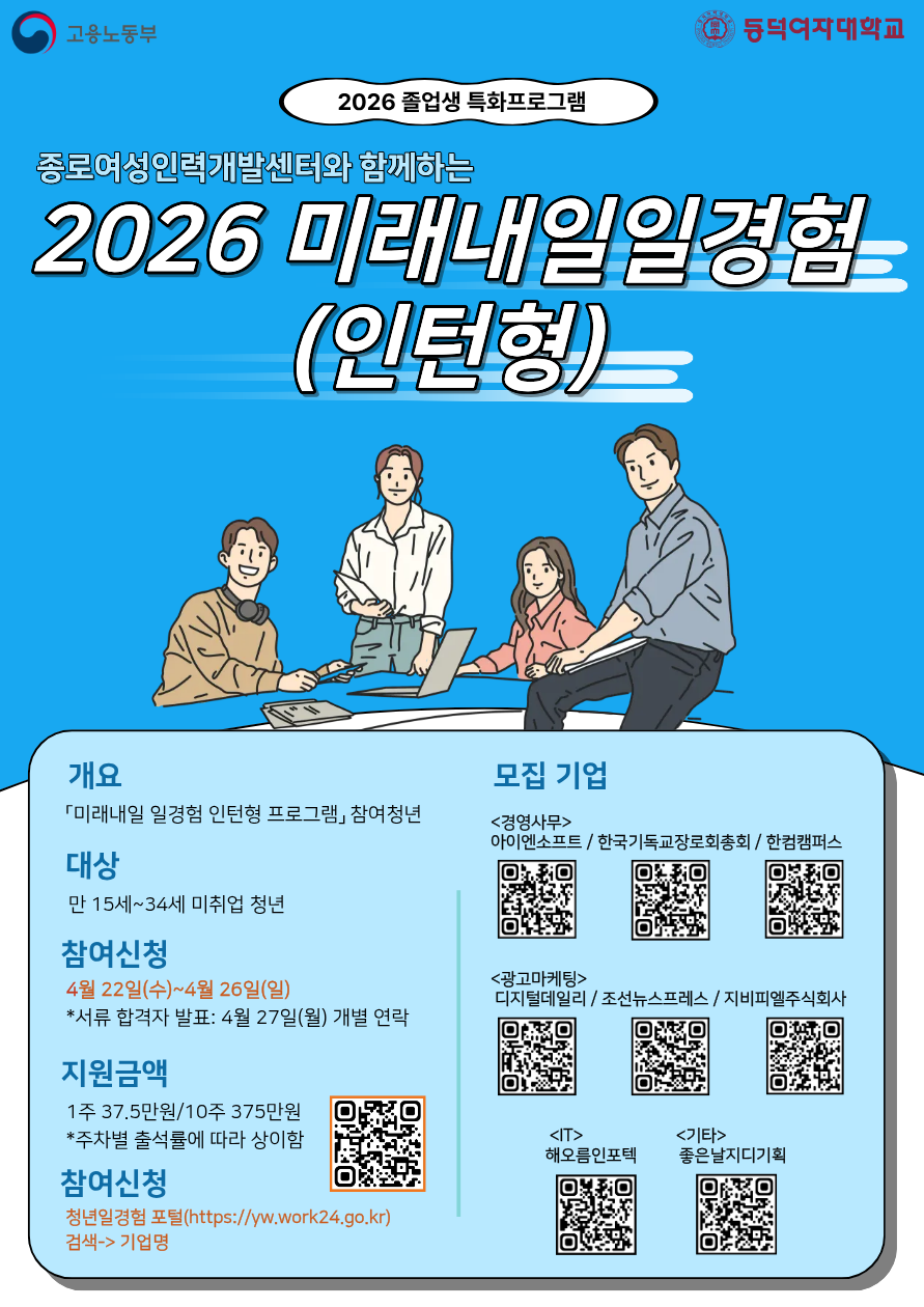 ▷ 고용24 신청: 고용24(https://www.work24.go.kr/) → 취업지원 → 졸업생 특화프로그램 → 동덕여자대학교 → 참여신청