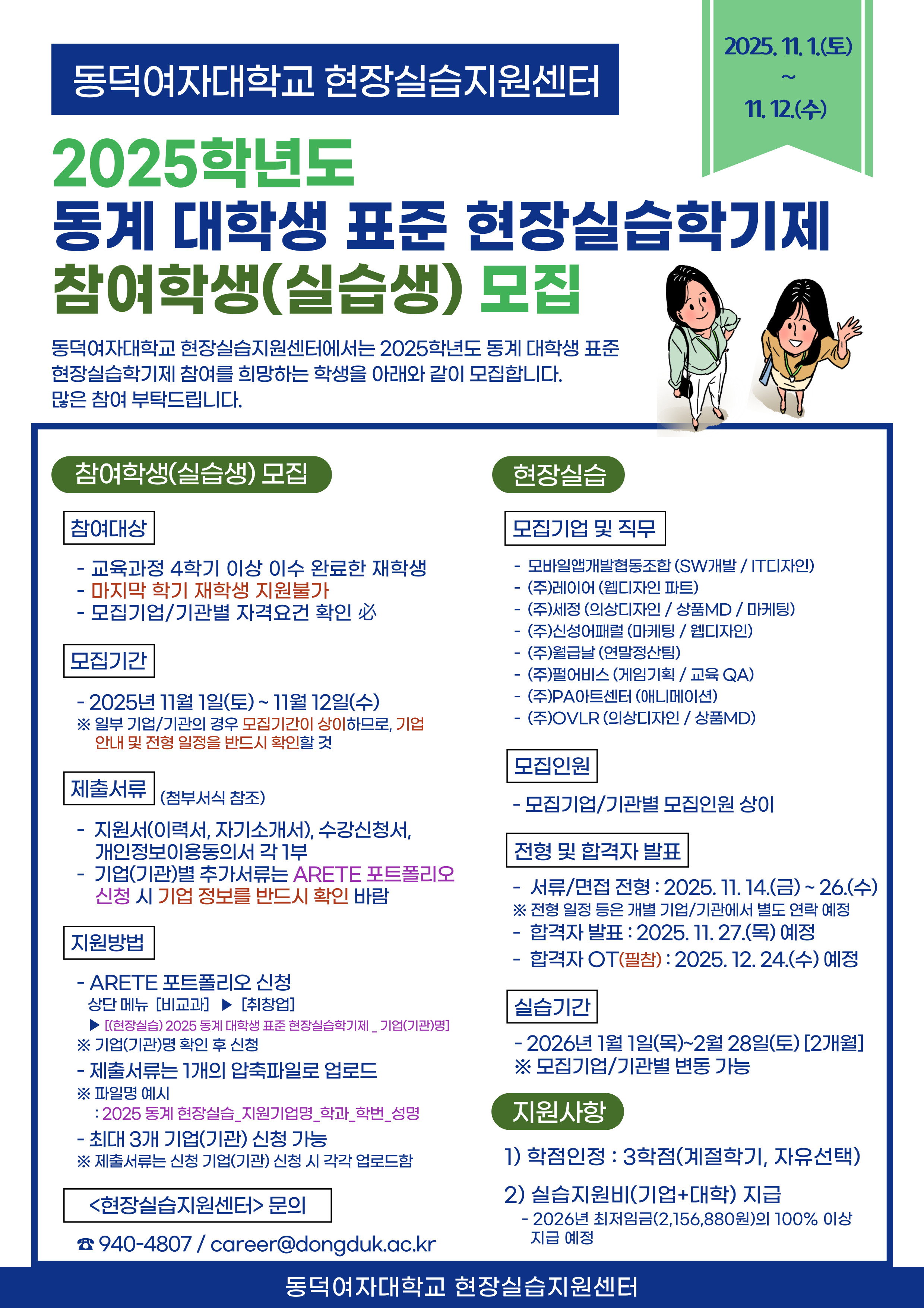- [취업경력개발원](기업 추가 재공지) 2025 동계 대학생 표준 현장실습학기제 참여학생(실습생) 모집 안내(11/1 ~ 11/12)