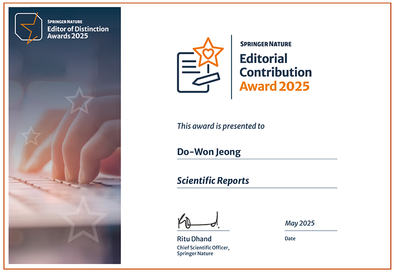 해당 수상은 Springer Nature가 매해 출판하는 저널지에 탁월하게 기여한 편집자에게 수여하는 상으로, 2025년에는 SCI급 국제학술지인 Scientific Reports 부문에서 정도원 교수의 활동이 주목받았다.