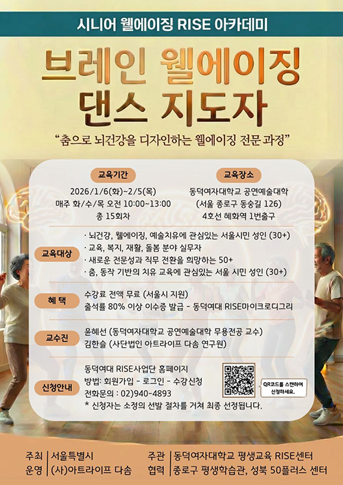 강좌는 공연예술대학 혜화캠퍼스에서 2026년 1월 6일에 개강해 총 15회로 진행된다. 교수진은 윤혜선 무용전공 교수와 (사)아트라이프 다솜의 김한슬 연구원 등 전문성을 갖췄다. 수강료는 전액 무료에, 수료 시 RISE 이수증 발급과 추가 과목 이수를 통해 마이크로디그리 인증도 받을 수 있다. 중장년에게 제2의 전문성을 확보할 기회라는 평가다. 서울 시민 30세 이상 성인 누구나 신청 가능하다. 신청은 RISE사업단 홈페이지에서 할 수 있다.