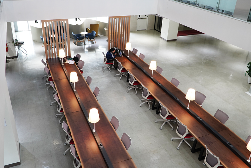 학생들의 선호도가 높은 3층의 성큰(sunken) 공간은 접근성을 개선했다. 당초 이곳은 10석 정도의 소규모 테이블이지만 환경이 쾌적해 대기자가 항상 발생했다. 이를 총 27석 규모로 확대한 것이다. 동시에 공간의 통일성이나 개방감, 채광 등은 그대로 유지했다. 각 좌석엔 콘센트와 USB 포트 등이 구비돼있다.