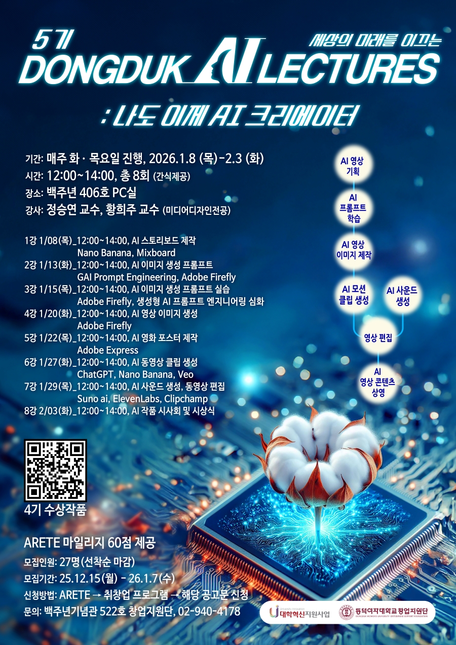 ▶ 5기 동덕 AI 렉쳐스 신청 바로가기: https://arete.dongduk.ac.kr/ptfol/imng/icmpNsbjtPgm/gnrl/findIcmpNsbjtPgmInfo.do?encSddpbSeq=7e20559f1951c6bac5af4d6ad64f7f34