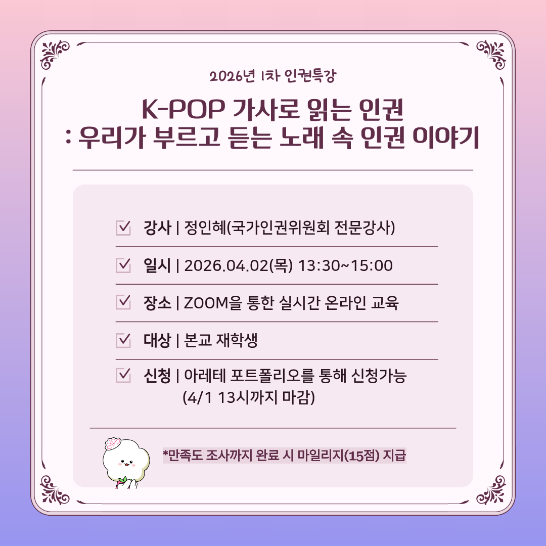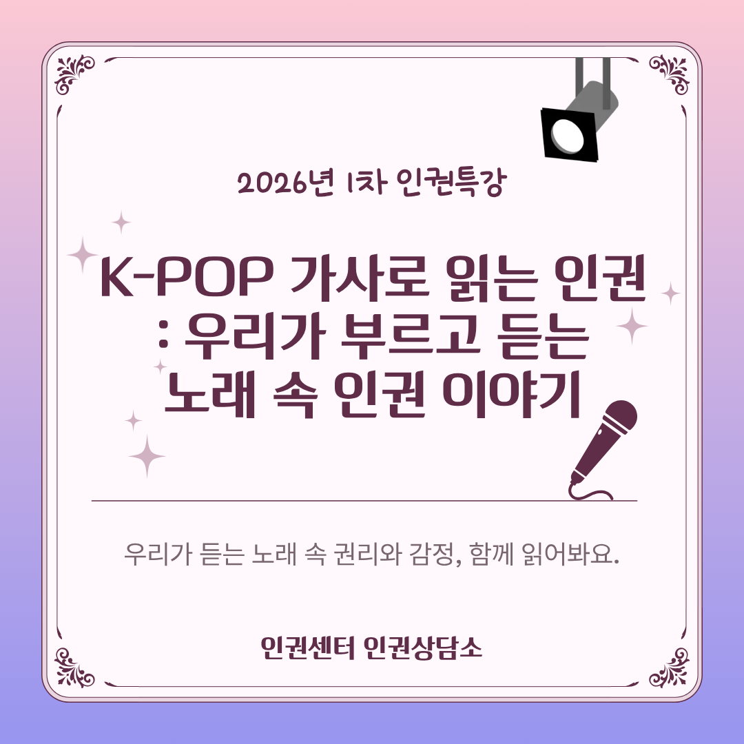 - [기타][인권센터 인권상담소] 2026년 1차 인권특강 <K-POP 가사로 읽는 인권: 우리가 부르고 듣는 노래 속 인권 이야기>